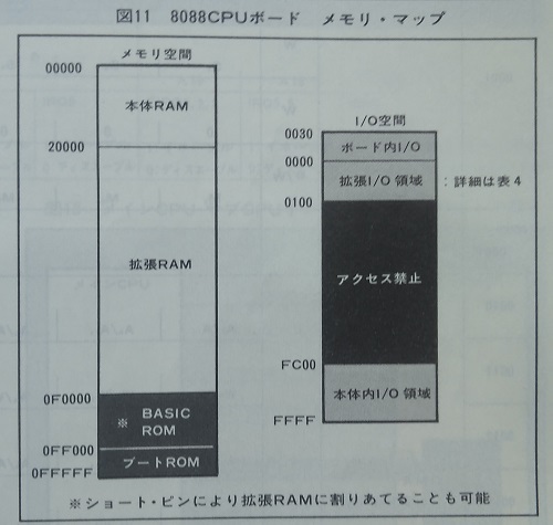 ※ショートピンにより拡張RAMへ割りあてることも可能 ↓ これは逆です。 こちらにも掲載しておりますが、出荷状態ではこの領域は拡張RAMに割り当てられており、 J1ピンヘッダーをジャンパーでショートするとオプションROMが有効になります。 BASIC ROMと明記されているので、F-BASIC86をROM化することも検討されていたのでしょう。 実際、FM16βSDでは、F-BASIC86がROM化されて搭載されていました。 0 -+-------------------+ | | | | | RAM領域 | | (FM-11本体) | | | F0000 -+ - - - - - - - - - + - +-------------------+ | | | | | | | オプションROM | | | | (未実装) | FF000 -+-------------------+ - +-------------------+ | ブートROM | FFFFF -+-------------------+