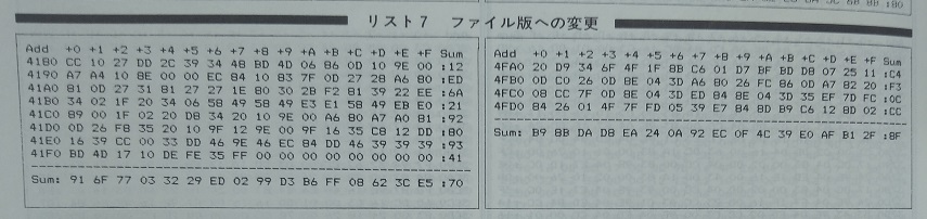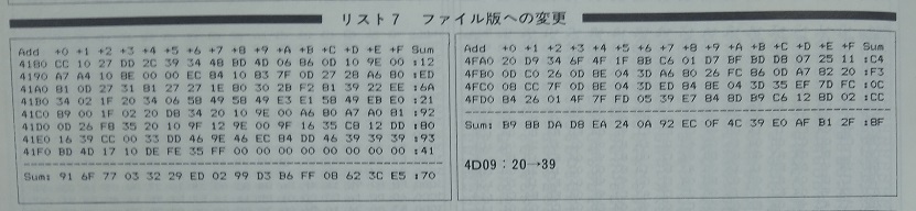 4D09:20→39 がこっそり追記されています。 これは、Kコンパイラのランタイム部分です。(オンメモリ版からファイル版へのパッチ) たった1バイトの違いですが、コンパイラの動きに大きな影響がありました。 具体的には、コンパイル時に大量の改行コードが出力されて画面が無駄にスクロールしていました。 市販版の Kコンパイラ V3.x 添付のマニュアルでは、初版のような記載モレはありませんでした。 従って、FM-7/11活用研究の初版を購入した人(=はせりん)のみ、この誤記の悪影響を受けていた事になります。 <改訂されていない誤記> 223ページ 表1 +--------+----------+---+-------------------------------------------+ | | | | ビット構成 | |アドレス| 内容 |R/W|bit7| bit6 |bit5|bit4|bit3|bit2|bit1|bit0| +--------+----------+---+----+--------+----+----+----+----+----+----+ ... +--------+ +---+----+--------+----+----+----+----+----+----+ | |標準フロッ| | |SIDE| | $FD34 |ピーインタ|R/W| あき | 0 | | |フェース | | | 1 | +--------+ +---+----+--------+----+----+----+----+----+----+ ↓ +--------+ +---+----+--------+----+----+----+----+----+----+ | |標準フロッ| | | DDEN | |SIDE| | $FD34 |ピーインタ|R/W| |0:単密度| あき | 0 | | |フェース | | |1:倍密度| | 1 | +--------+ +---+----+--------+----+----+----+----+----+----+ これは酷い誤記(記載モレ)です。こんなんではプログラミングできませんし、 この誤記が永年放置されてきた、というのも信じ難い。 工学社は富士通から提供された資料をそのまま転記してるだけだと思うので、 元々の富士通側資料が間違ってた可能性もありますね。 229ページ 右側中ほど 図11 8088CPUボード メモリ・マップ